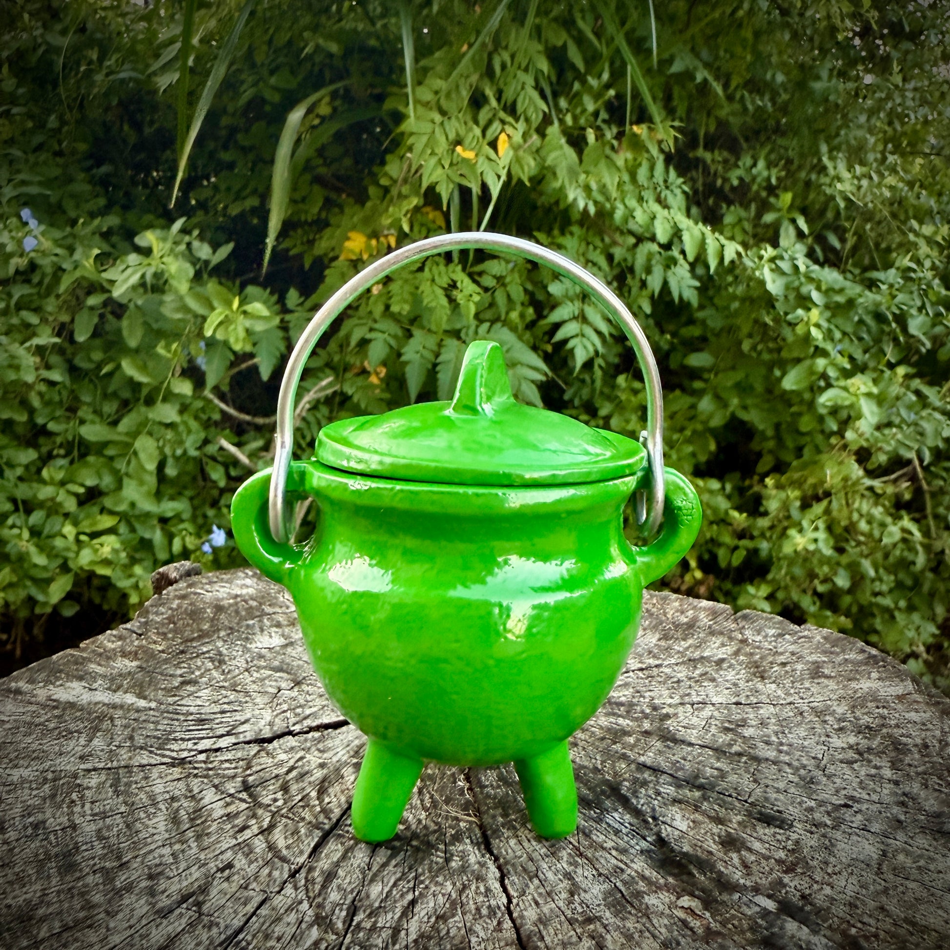 High-quality 3" x 3" cast iron cauldron in vibrant green. Featuring a secure lid and convenient carrying handle, this versatile cauldron is ideal for any mystical enthusiast.