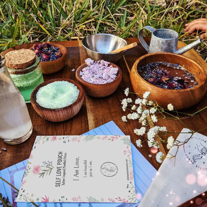 The Self Love Pouch, a portable potion-making kit designed to inspire imaginative play, exploration, and personal growth. Perfect for on-the-go adventures, this enchanting pouch encourages children to have fun, set intentions, and cultivate a positive mindset.